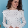 Beyaz Üzeri Lacivert Puantiyeli Omuzlari Volanli Bluz