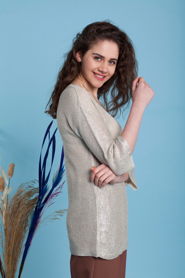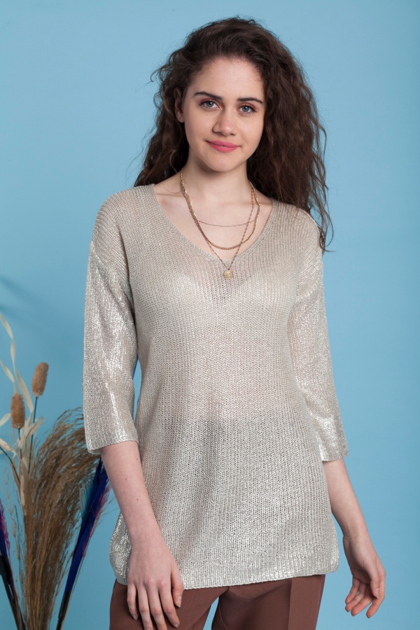 Etiketler: triko, triko kazak, triko üst, v yaka kazak, varaklı triko kazak