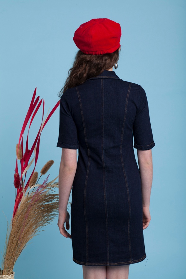 Önü Düğmeli Likralı Kısa Kollu Yakalı Kot Elbise