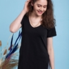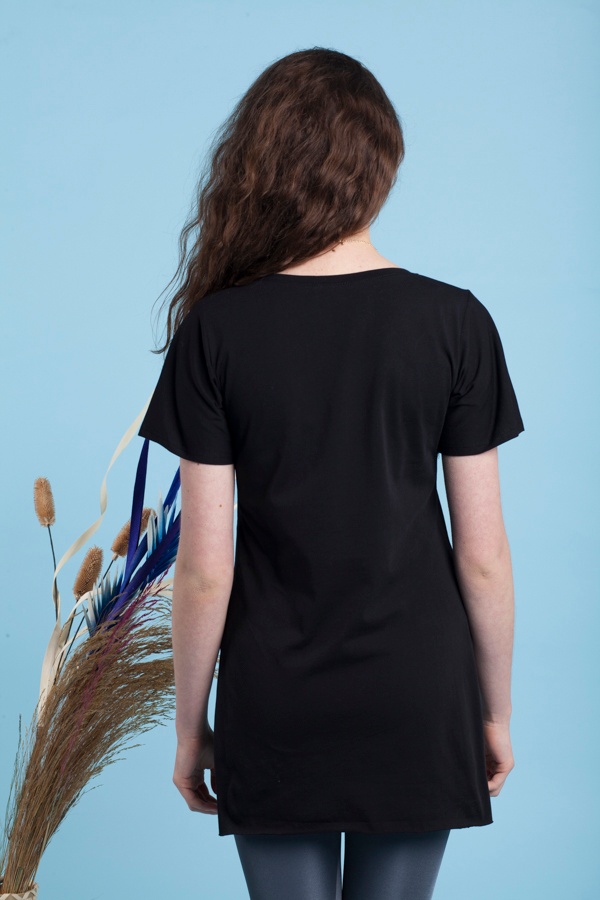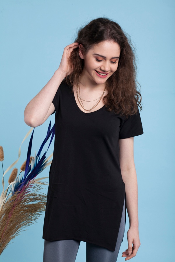 Siyah V Yakalı Yanları Yırtmaçlı Uzun Tshirt